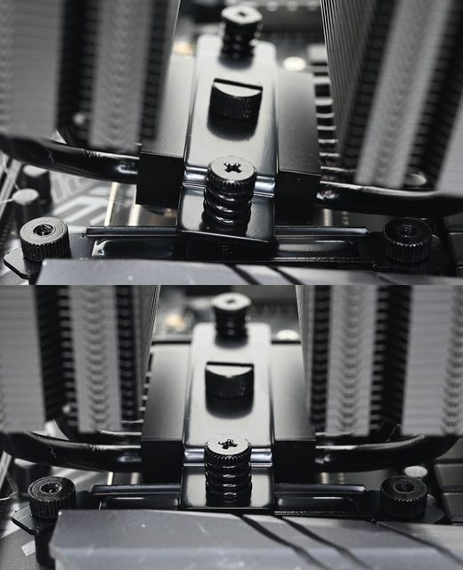 ▼從側面看,雙塔下方9片散熱鰭片縮小,壓板中間用1個手轉螺絲固定在散熱器底座頂部