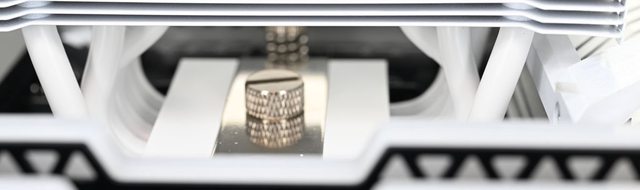 ▼散熱器底座兩邊各伸出6支直徑6mm熱導管,並在熱導管上安裝50片鰭片。壓板中間用1
