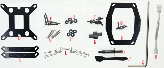 托架(N)、暴力熊散熱膏(O)、刮刀(P)、長柄十字起子(Q)、風扇降速線(R)