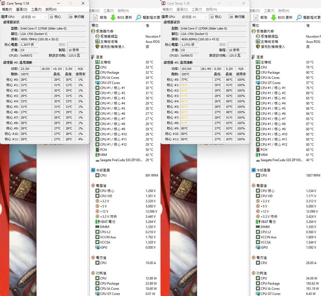▼待機(左)及高負載(右)的CORE TEMP及AIDA64感測器畫面