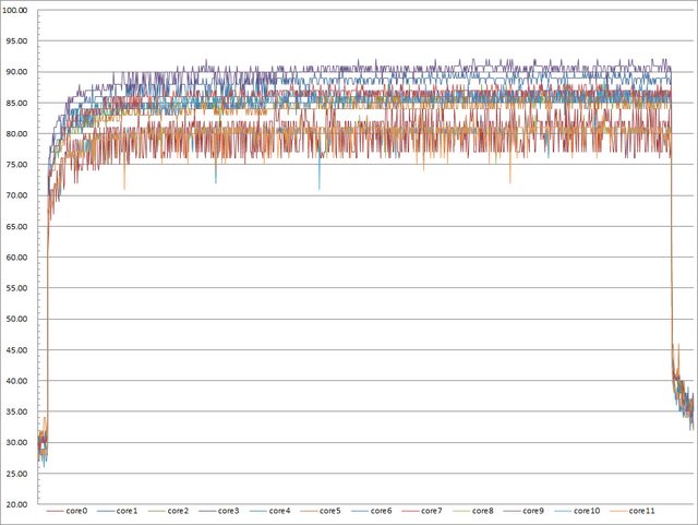 ▼高負載30分鐘CORE TEMP溫度記錄圖