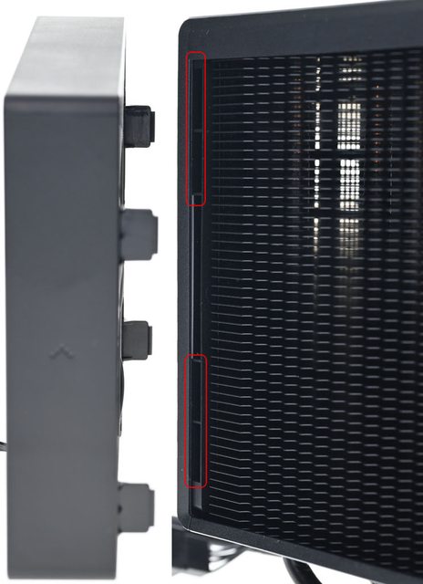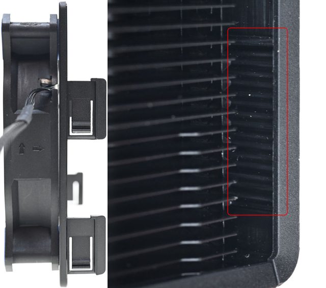 ▼散熱器後方風扇固定框開口可直接看到扇葉,左/右邊有網狀通風口