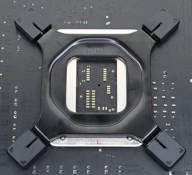 ▼散熱器底座的壓板兩邊設置鎖在托架上的彈簧螺帽,處理器接觸面有一張保護貼,上面