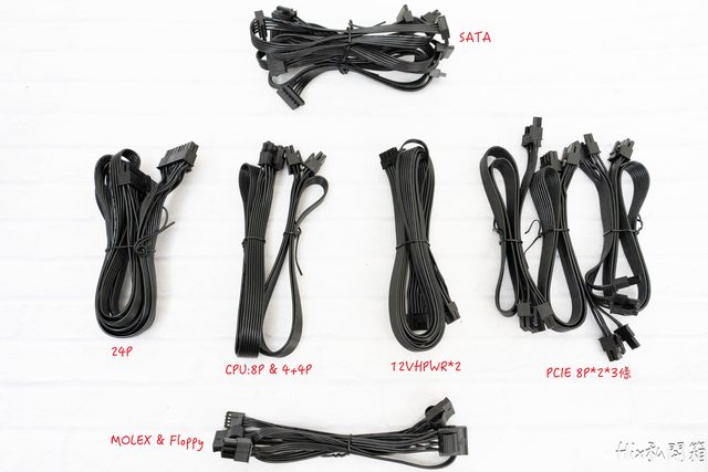 24P*1、CPU 8P*2、12VHPWR*2、PCIE 雙8P*3、SATA*9、MOLEX*3以及FLOPPY*1
