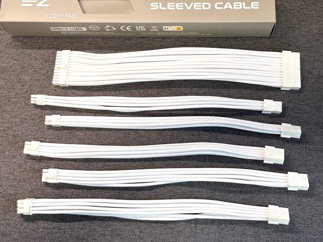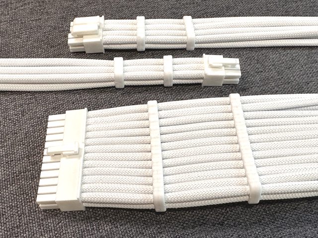 全白編織延長線以套件方式販售,共有主機板24P一條、CPU4+4P1條、PCI-E 6P兩條、