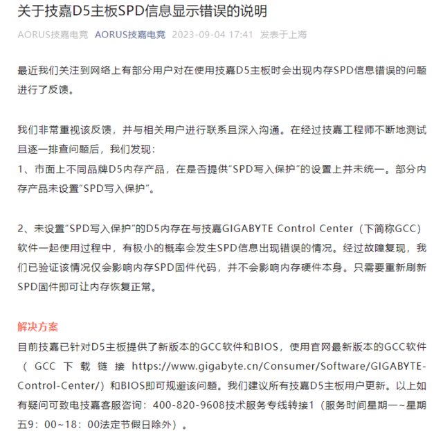 對此,技嘉表示該情況僅會影響記憶體 SPD 固件代碼,並不會影響記憶體硬體本身