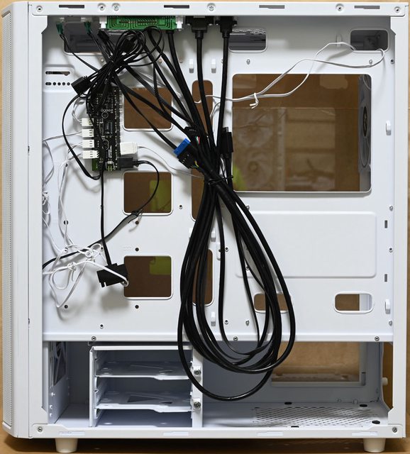 ▼電源艙側邊開口可看到電源供應器側面,頂部靠近底板處有2個長方形穿線開口,前方