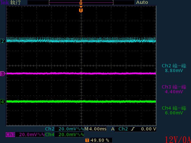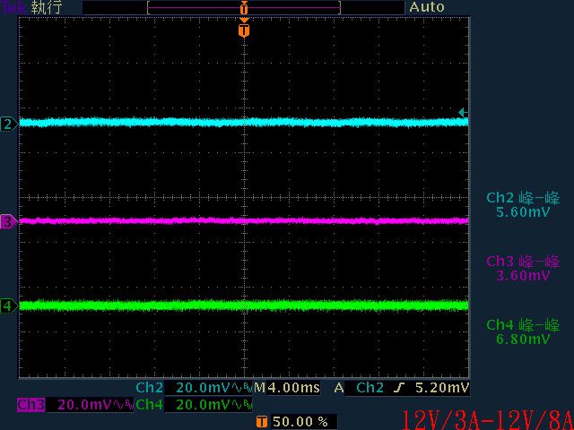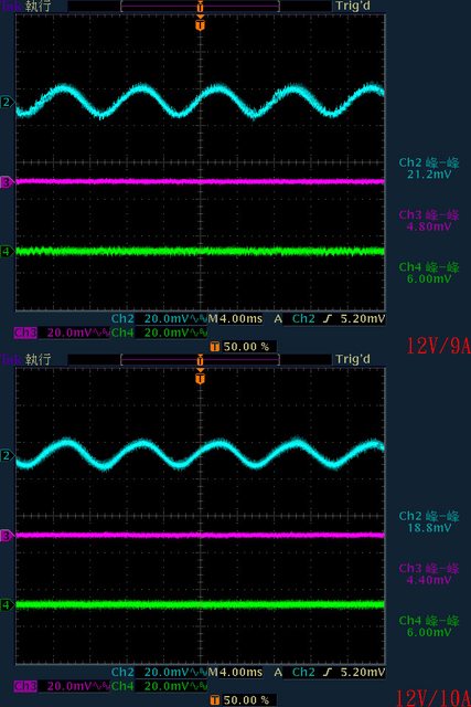 ○輸出無負載時12V有鋸齒狀漣波;輸出12V/3A至12V/8A時有最小12V漣波;輸出12V/9A時