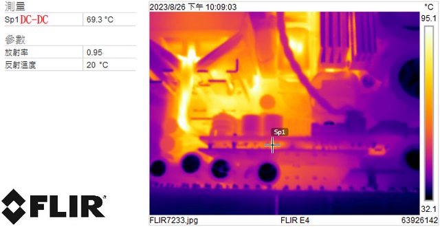▼電源供應器滿載輸出下DC-DC(下圖)的紅外線熱影像圖(附註:安裝位置環境溫度會影響