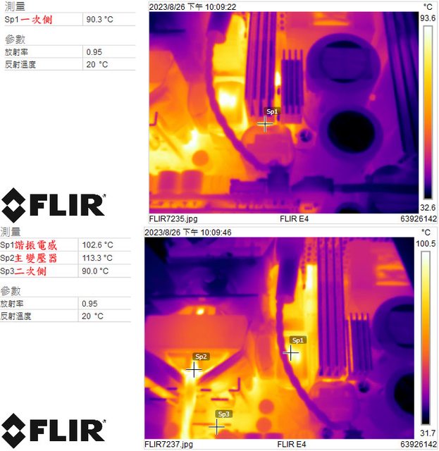 ▼電源供應器滿載輸出下一次側(上圖)及諧振電感/主變壓器/二次側(下圖)的紅外線熱影