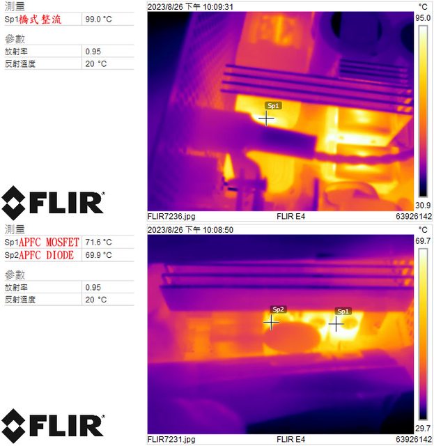 ▼電源供應器滿載輸出下橋式整流(上圖)及APFC MOSFET/APFC DIODE(下圖)的紅外線熱影