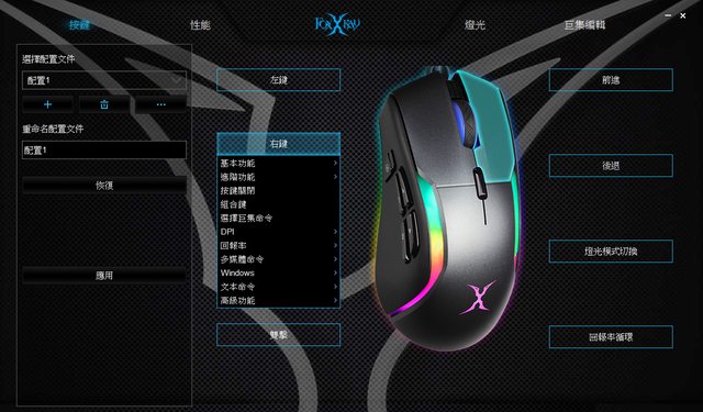 首先是按鍵區,跟眾多電競鼠一樣,各按鍵都能指定自己想要的功能