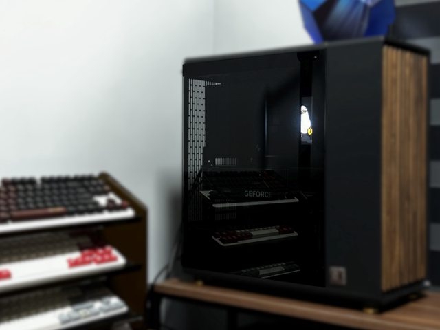蓋上玻璃側板,如果是黑色機殼/深色的玻璃側板基本是看不到支架,只會看到螢幕。