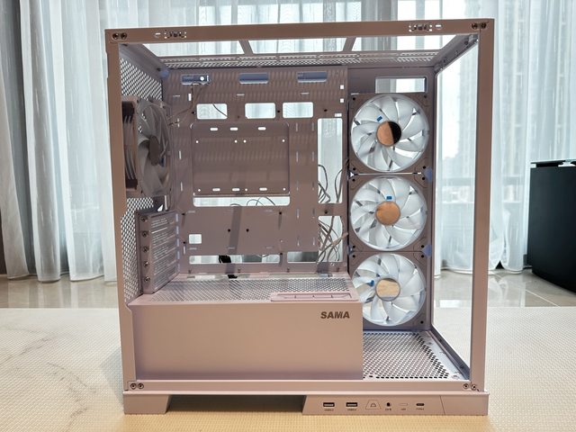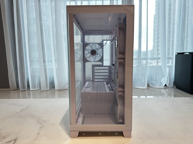 45度角後是機殼正面,前方及左側都採用4mm玻璃側板,散熱配置採用側進風,上、後出