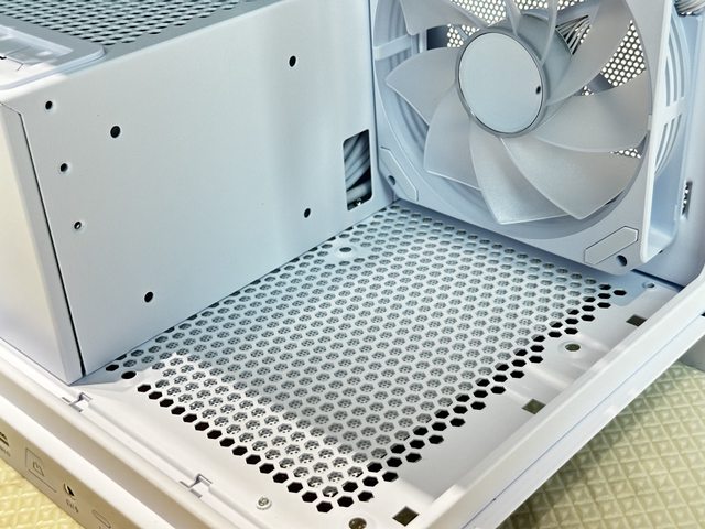 電源倉上方採用通風開孔,但沒有設置風扇孔位,想安裝風扇就只能自己找洞鑽。外側上