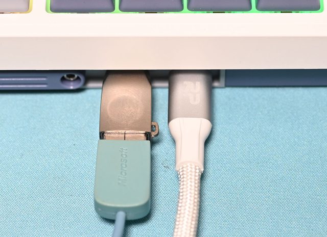 ▼鍵盤上方右側設置USB-C插座,除了使用隨附的線以外,也可自行更換其他線材。右邊