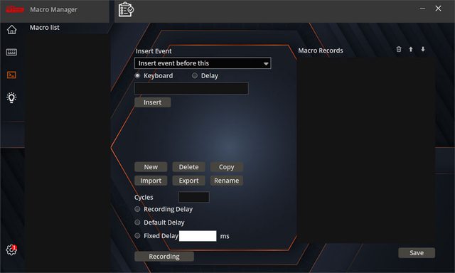 ▼應用程式左邊功能列選擇巨集,可進行鍵盤巨集錄製、管理及調整相關設定