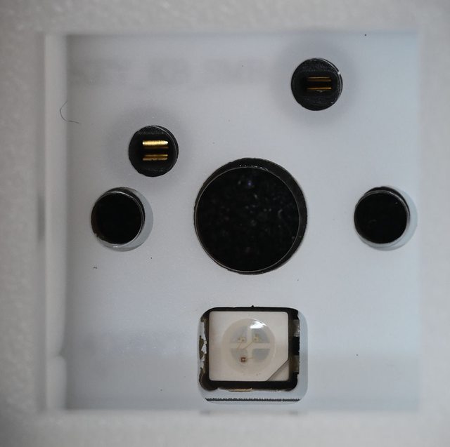 ▼鍵軸熱插拔座相容3腳/5腳鍵軸,RGB LED位於下方,中間大孔及左右小孔為固定銷孔,