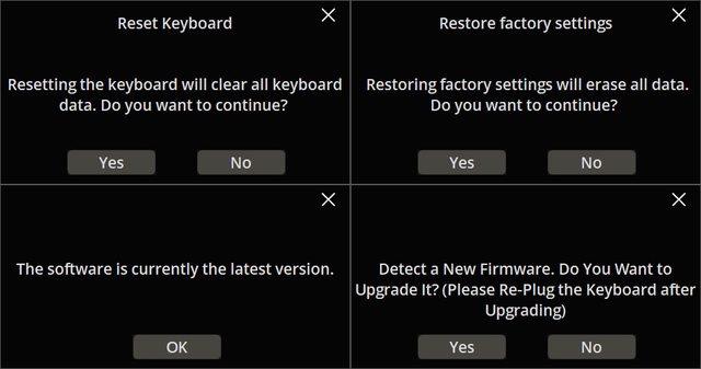 ▼選擇重置鍵盤資料、回復出廠預設值、應用程式升級、鍵盤韌體更新時,會出現確認對