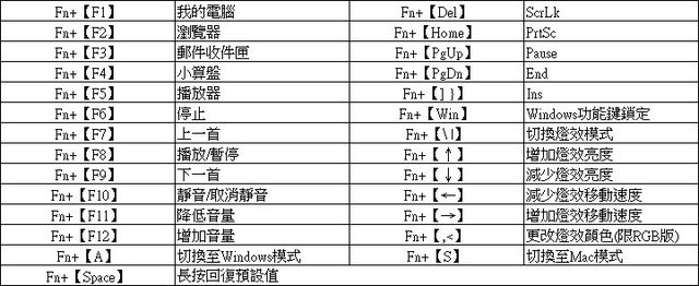 ▼其他功能按鍵、Win/Mac切換、Windows鍵鎖定及燈光控制相關的Fn組合按鍵功能同樣印