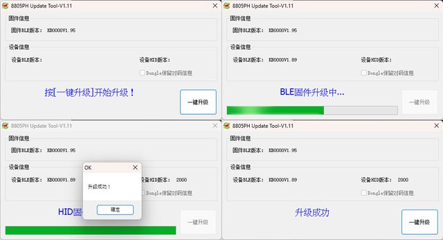 縮後執行更新程式,會出現如下畫面,短按"一鍵升級"會更新內部BLE及HID韌體,升級完