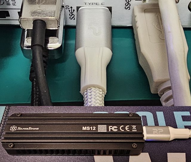 ▼銀色款線材一端接上主機板後方USB3.2 Gen2x2埠(上圖),另一端接上銀欣MS12外接盒(