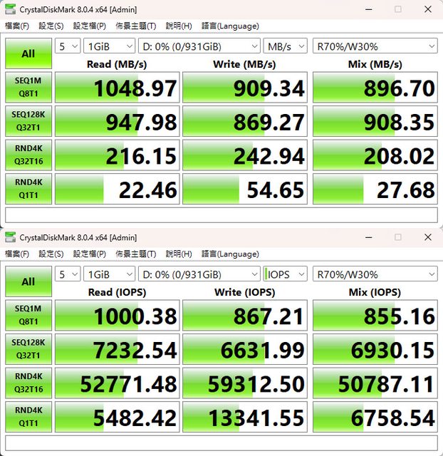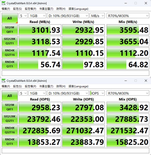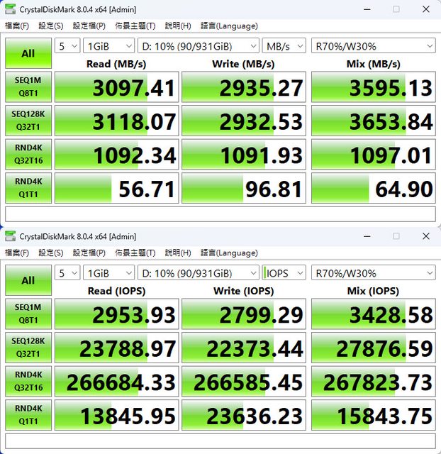 CrystalDiskMark預設+R70%/W30% Mix測試
