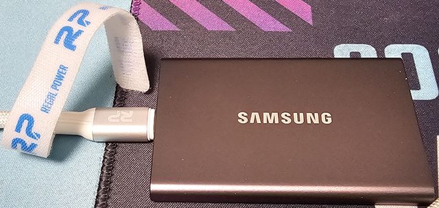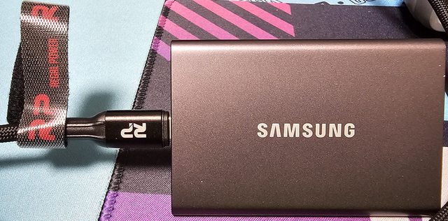 ▼主機板USB3.2 Gen2x2埠經銀色款線材連接SAMSUNG T7 1TB外接式SSD的