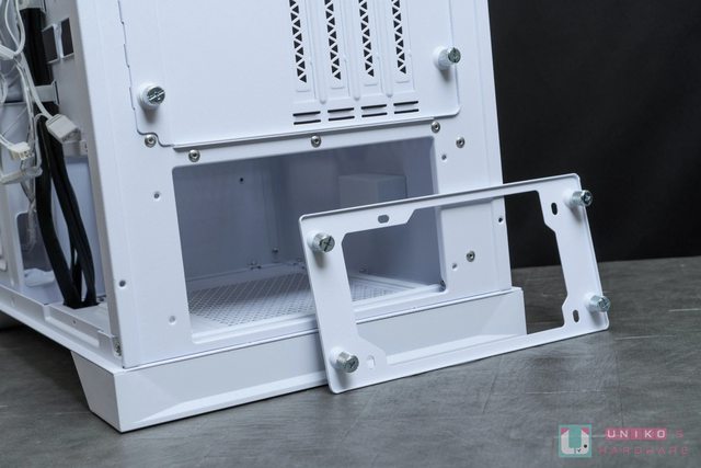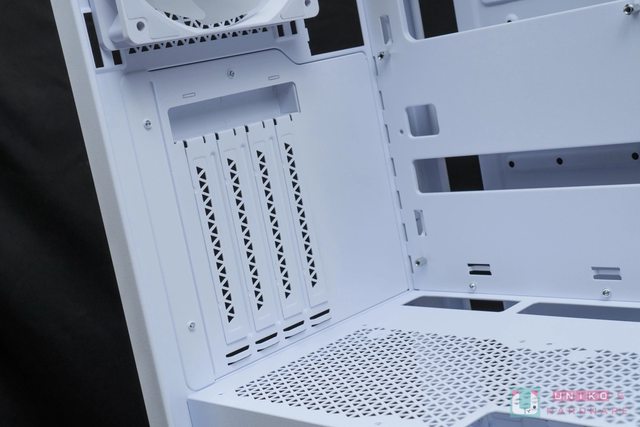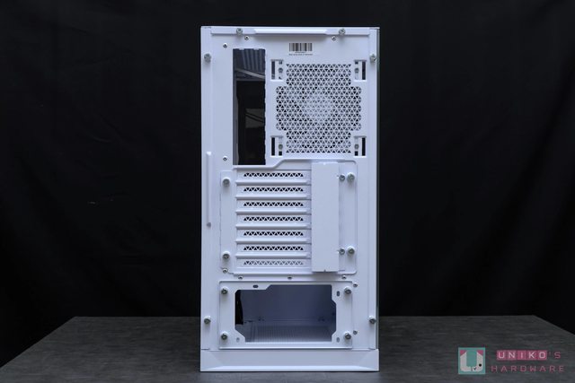 機殼後方中段預設支援 7 組水平顯示卡 PCIe 槽位,下方電源供應器部分支援 ATX 尺寸,