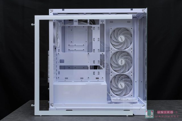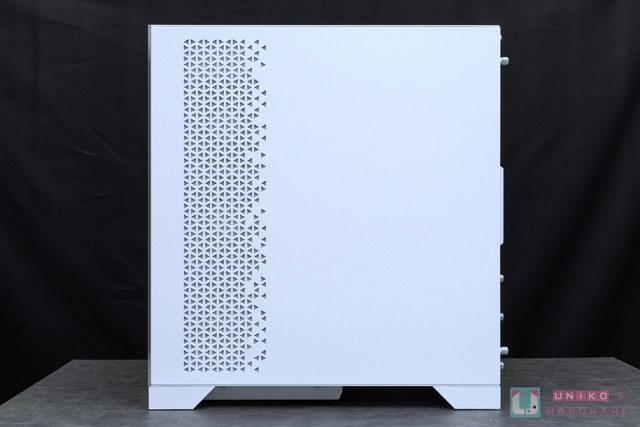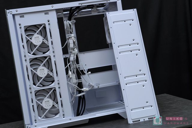 來看看另一側板拆開後預先整線和其餘空間佈局,可見側面風扇進氣部分同樣是做了三角 M