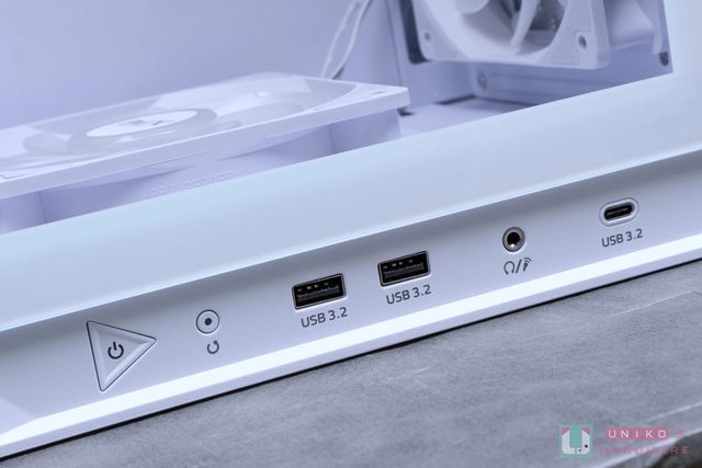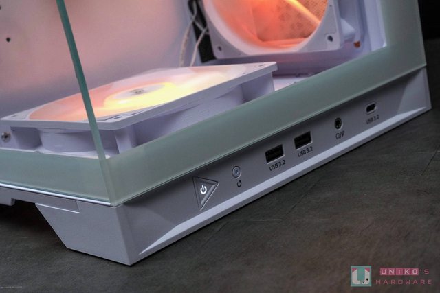 -C x1、USB 3.2 Type-A x2、3.5 mm 耳麥和開機、重啟鍵,按鍵彈性相當不錯,三角形的