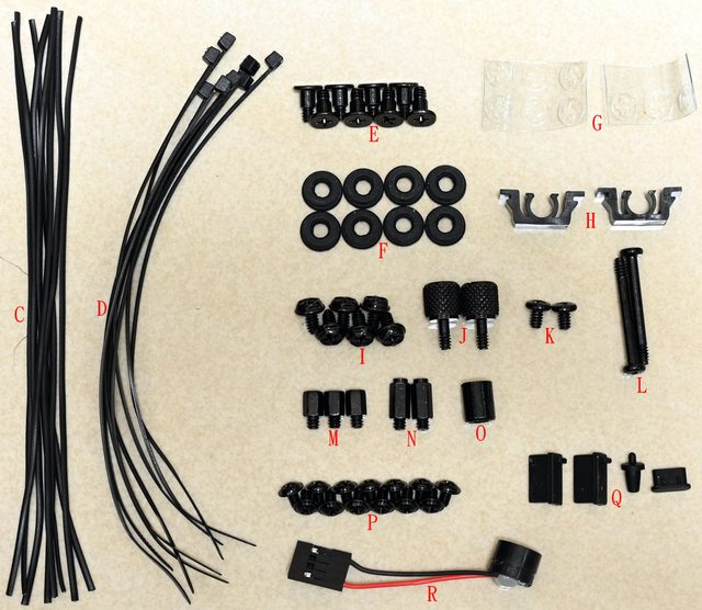 (F)、螺絲透明墊片(G)、備用卡榫固定扣(H)、電源/介面卡螺絲(I)、備用手轉螺絲(J)、