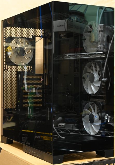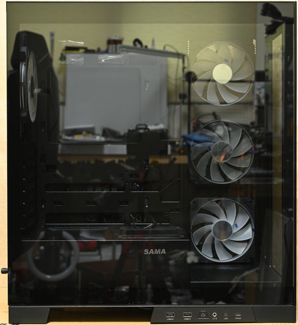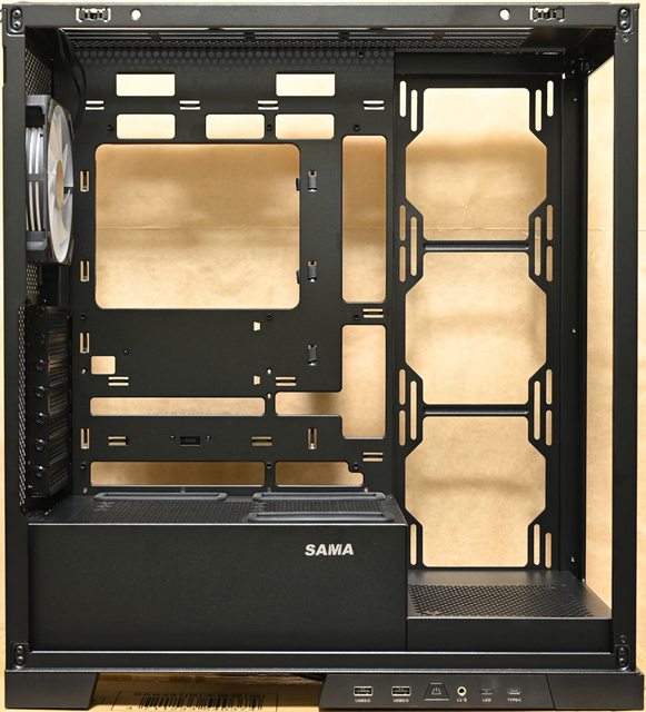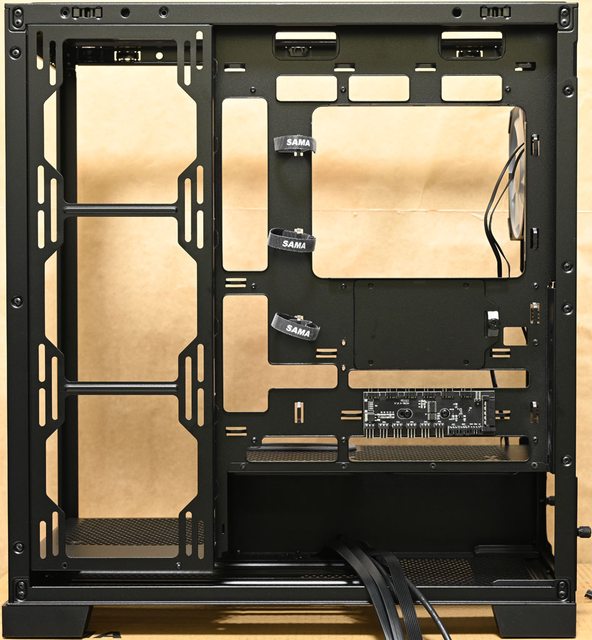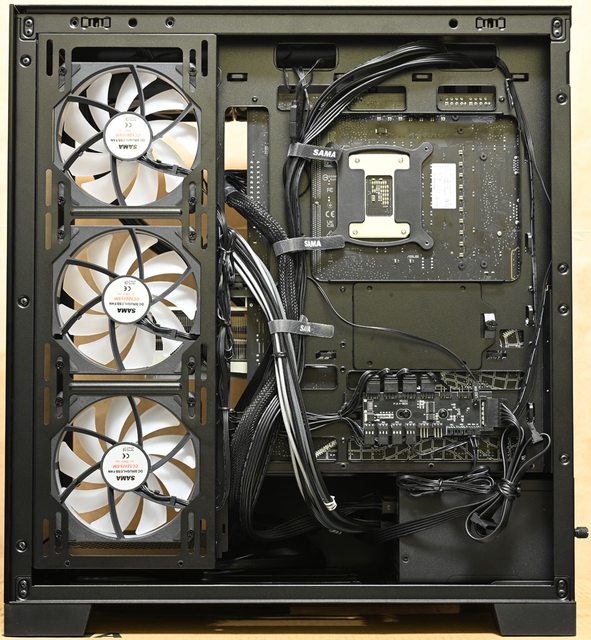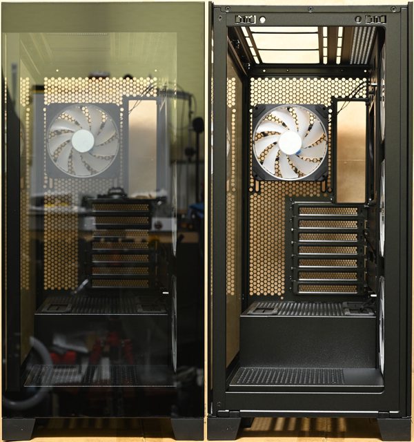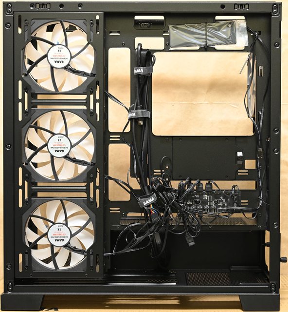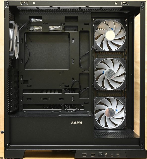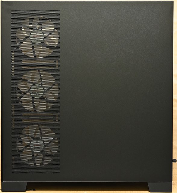 ▼機殼左側結構,右側前方預裝3個ARGB發光120mm反向風扇