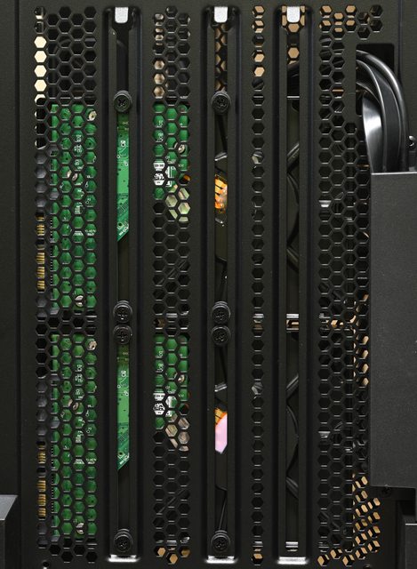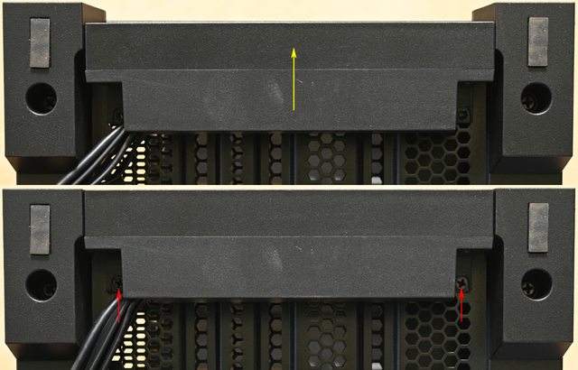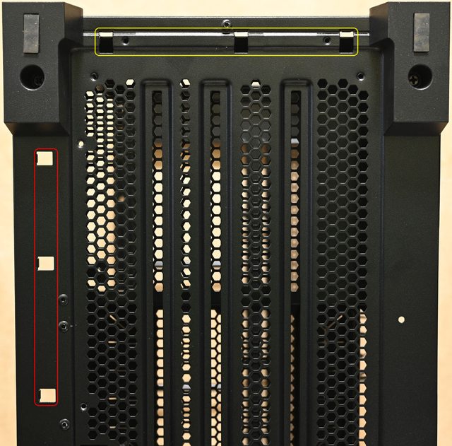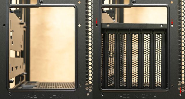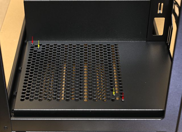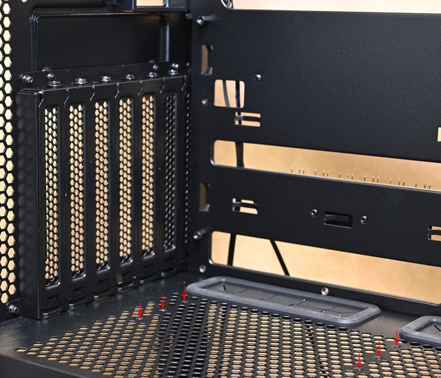 ▼電源艙上方網狀隔板有6個顯示卡延長線銅柱鎖點(紅色箭頭),可對應3個垂直擴充槽(