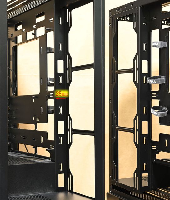 ▼右側前方風扇固定板與底板之間落差28mm,交界處側面有3個風扇穿線開口及6個整線固