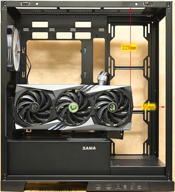 顯示卡頂部與機殼頂部風扇固定板距離220mm,顯示卡前端與機殼前方面板距離95mm