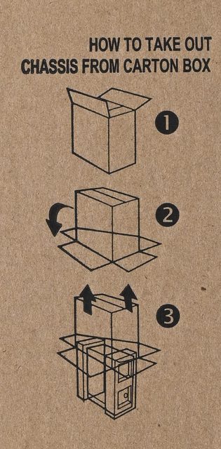 ▼打開外箱,內面印上取出機殼方式(①完全打開外箱開口②翻轉外箱使開口朝下③將外