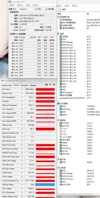▼CPU+GPU高負載30分鐘後Core Temp、GPU-Z感測器、AIDA64感測器頁面