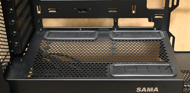 ▼頂部配置金屬網孔板,自後方把手處施力往上拉即可開啟。長條形固定孔可裝3個120mm