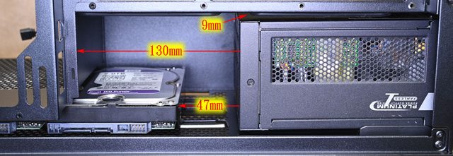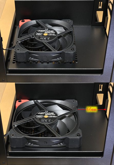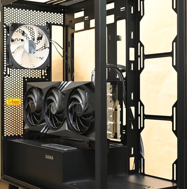 顯示卡背面與機殼右側前方風扇固定板距離95mm,顯示卡底部與機殼底部前方風扇固定板