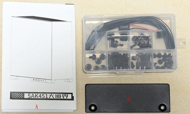 ▼除了安裝說明書(A)及直立擴充槽蓋板(B)分開放置外,其餘配件都收納在透明分類盒內