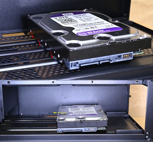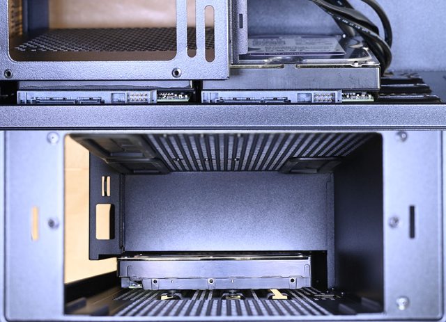 ●機殼底部導軌可安裝2個3.5吋硬碟,底板背面活動式固定板可安裝1個2.5吋SSD