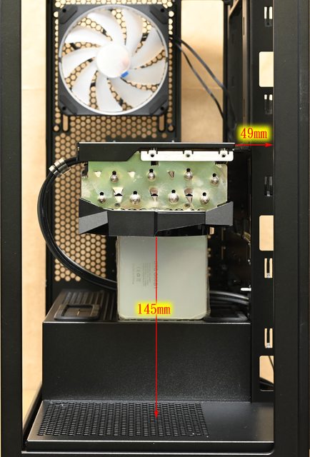 顯示卡底部與機殼右側前方風扇固定板距離49mm,顯示卡正面與機殼底部前方風扇固定板