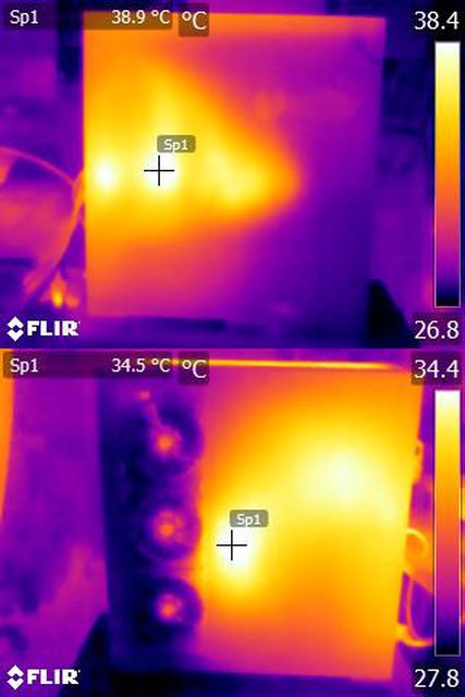 ▼CPU+GPU高負載30分鐘後的左側(上)及右側(下)的紅外線熱影像圖