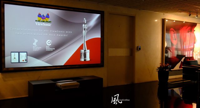 照片中左方透過投影機展現運用科技結合藝術的辦公空間氛圍,讓優派的辦公室氛圍有別
