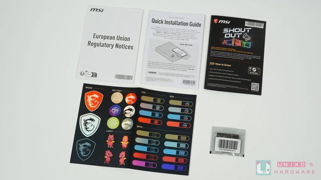 配件包含有 1 份歐盟規範文件、1 份快速安裝指南、1 份微星 SHOUT OUT 活動介紹、1 張