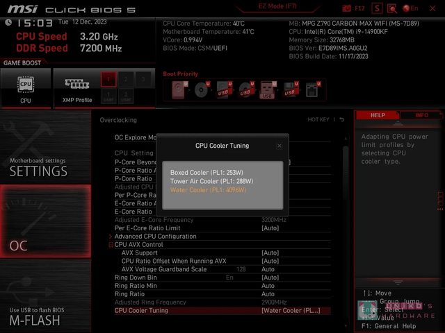 BIOS 的設定也相當簡單,基本上就是打開 XMP DDR5-7200,CPU Cooler Tuning 處理器散