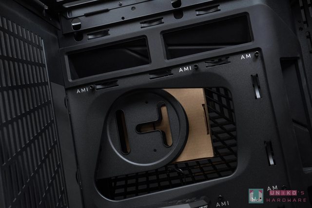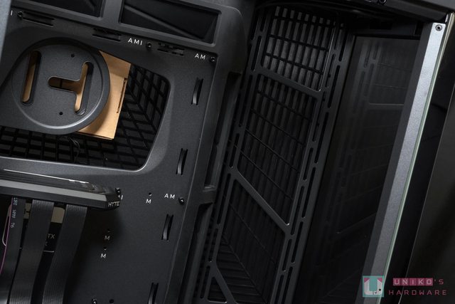 L 型整線槽和束帶口,中央也預留 CPU 散熱器腳架更換的鏤空位置,比較貼心的地方是和