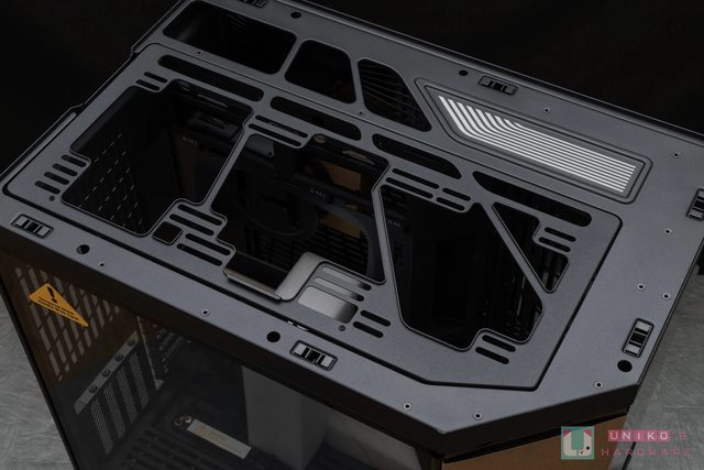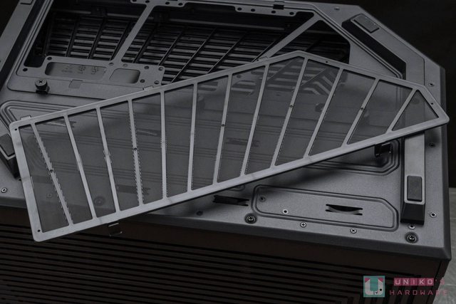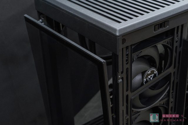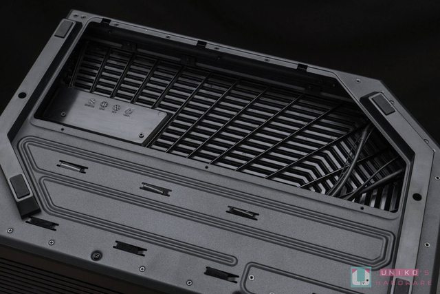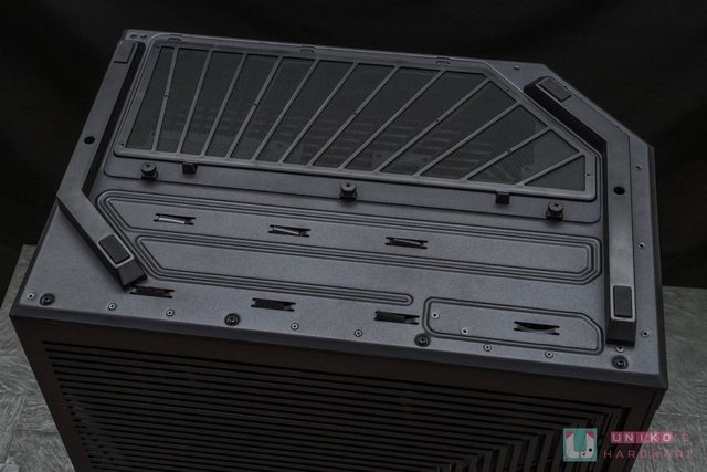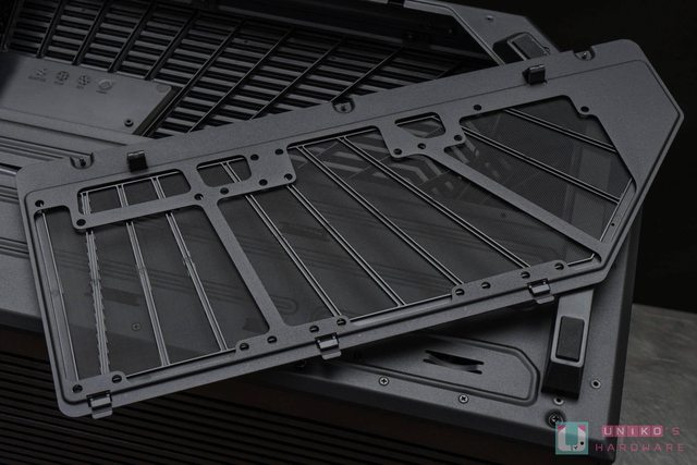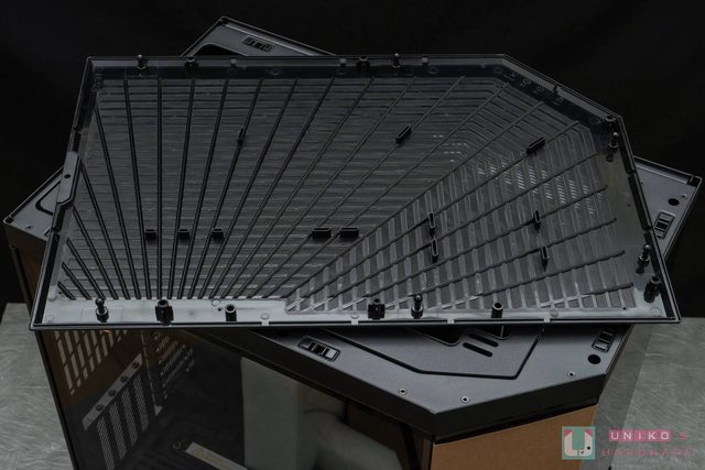 首先先來看看機殼上蓋,這次採用對應三面全景玻璃線條做為散熱網孔,拆裝時為無螺絲設