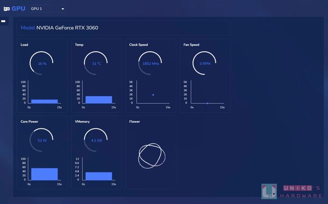 比如像是 CPU 和 GPU 部分點擊可見現在負載、溫度、時脈、功耗等等。